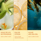 – Ingrédients : Hydrolat de citron*, Glycérine, Pentylene Glycol, Eau, Polyglyceryl-3 Distearate, Huile de Carthame*, Caprylic/Capric Triglycéride, Huile de Colza, Huile d’Argousier*, Isosorbide Dicaprylate, Huile d’Églantier*, Extrait de Criste Marine*, Extrait d’algue Arc-en-Ciel*, Extrait de Fleur de Lys Blanc, Extrait de Racine de Guimauve, Extrait de Son de Riz, Extrait de Racine de Réglisse, Huile de Tournesol, Gomme Xanthane, Tocopherol (Vitamine E), Sodium Levulinate, Sodium Anisate, Polyglyceryl-3 Diisostearate, Acide Citrique.